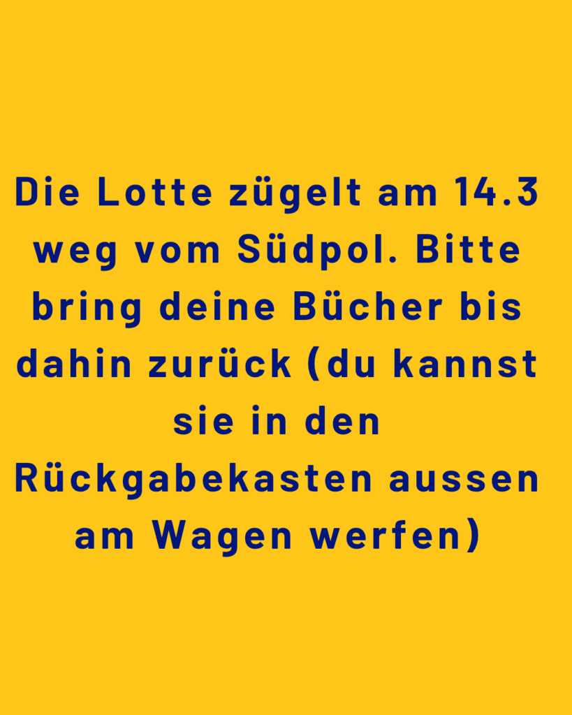 Die Lotte zügelt am 14.3. weg vom Südpol. Bitte bringe deine Bücher bis dahin zurück (du kannst sie in den Rückgabekasten aussen am Wagen werfen).
