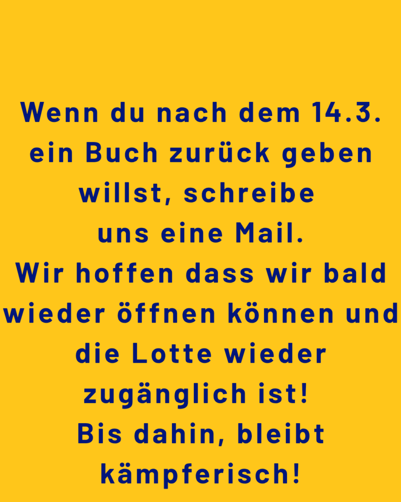 Wenn du nach dem 14.3. ein Buch zurückgeben willst, schreibe uns eine Mail. Oder schicke das Buch an unsere Postadresse: Lotte Bibliothek, Bernstrasse 67, 6003 Luzern. Wir hoffen dass wir die Lotte bald wieder öffnen können und die Lotte wieder zugänglich ist. Bis dahin, bleibt kämpferisch!